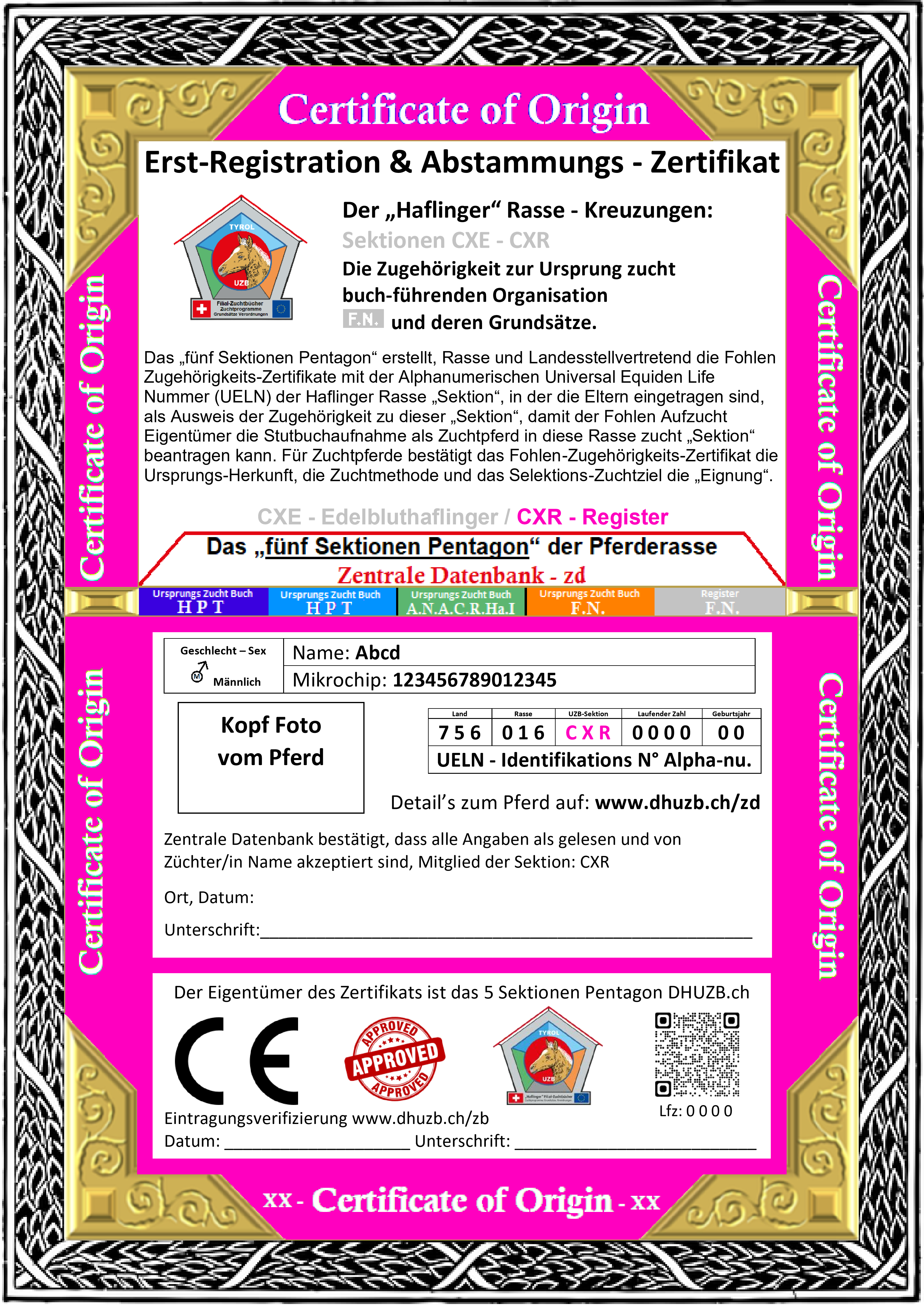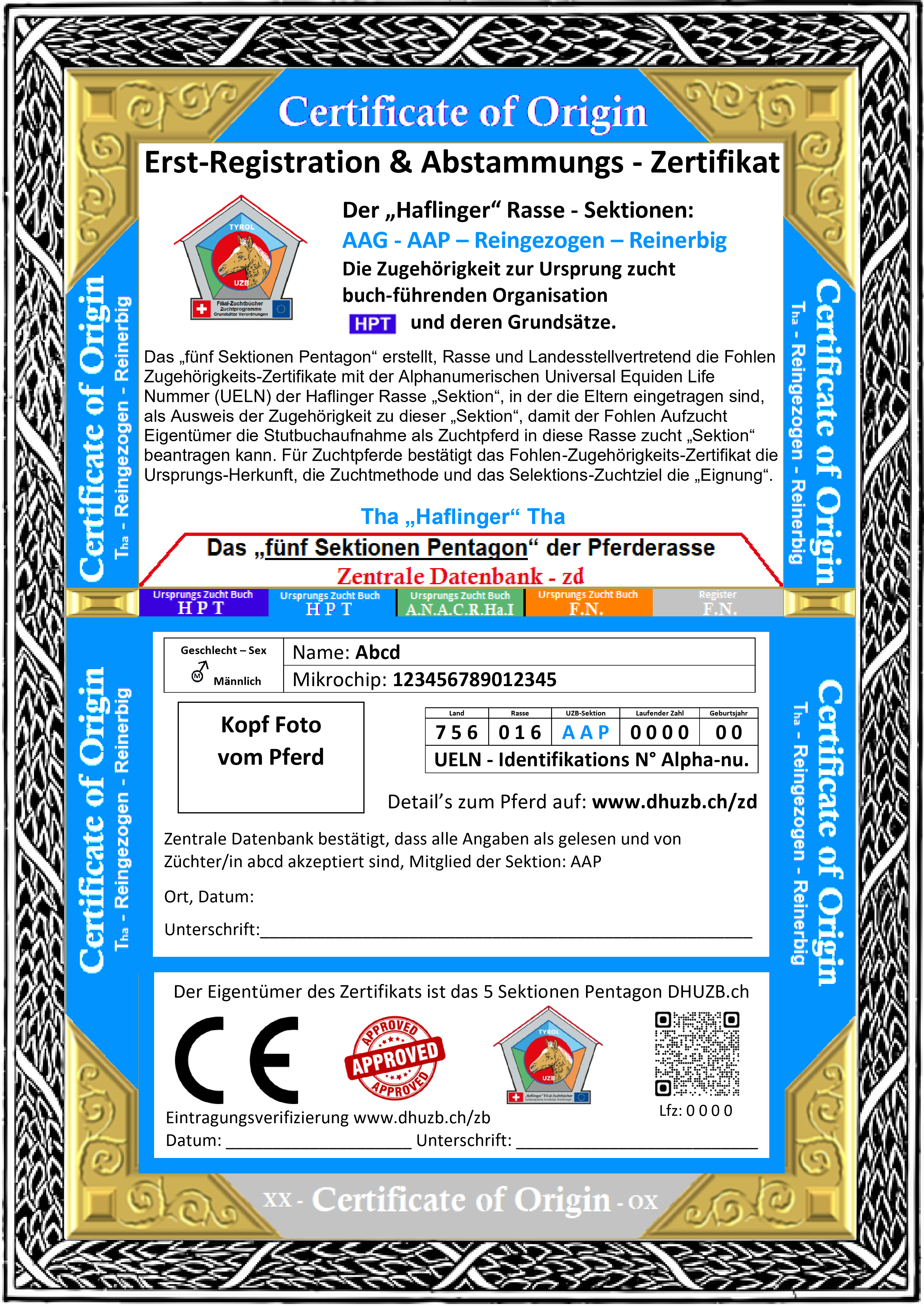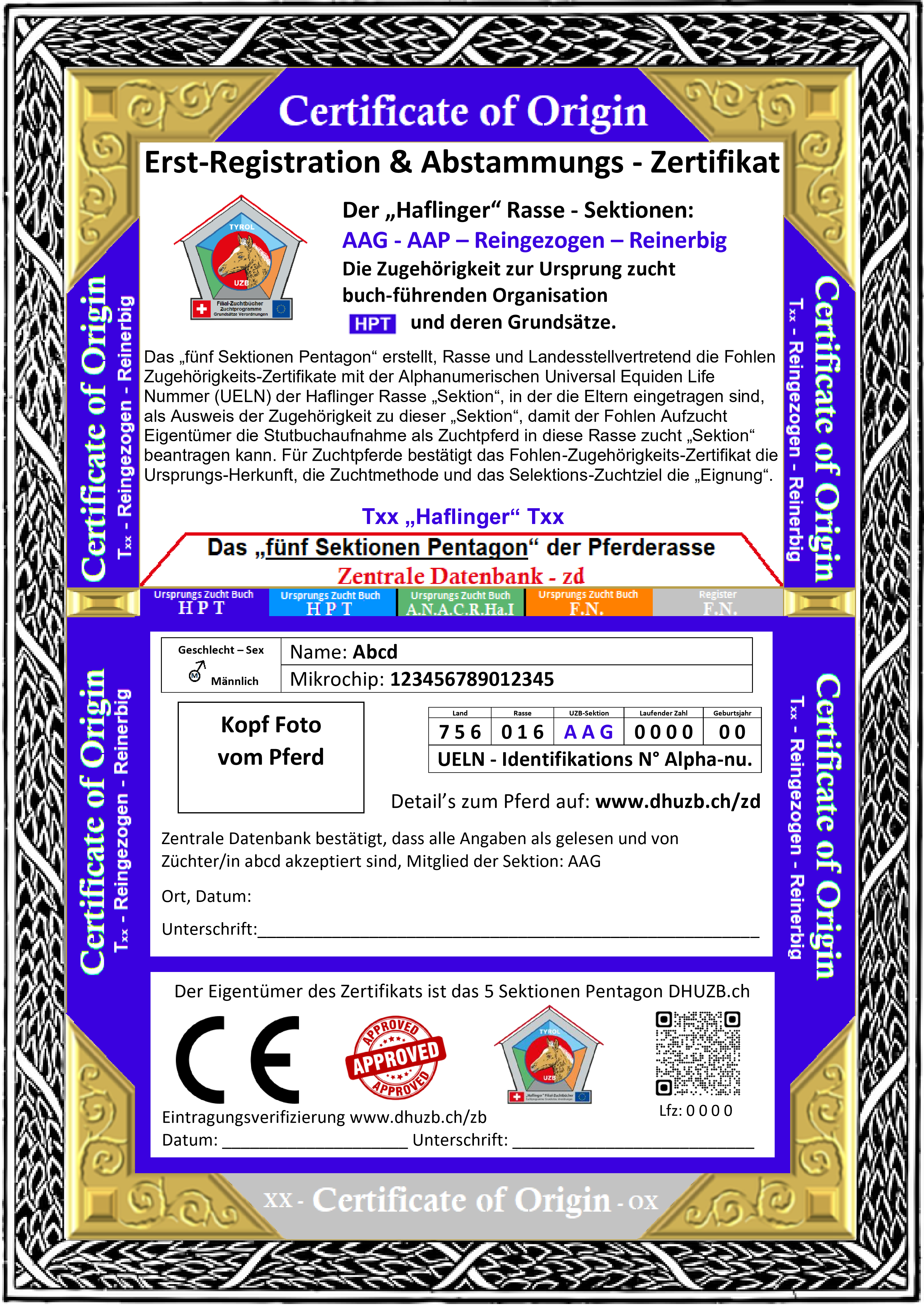 -Brexita-CH 1697, 19 - ist die Laufendezahl der UELN, die Bestätigung zur Eintragung in der Zentrale Datenbank www.dhuzb.ch/zd. Die Erst-Registrations - Fohlen erhalten denn Zugerhörigkeit - Ausweis der Sektion AAG -
